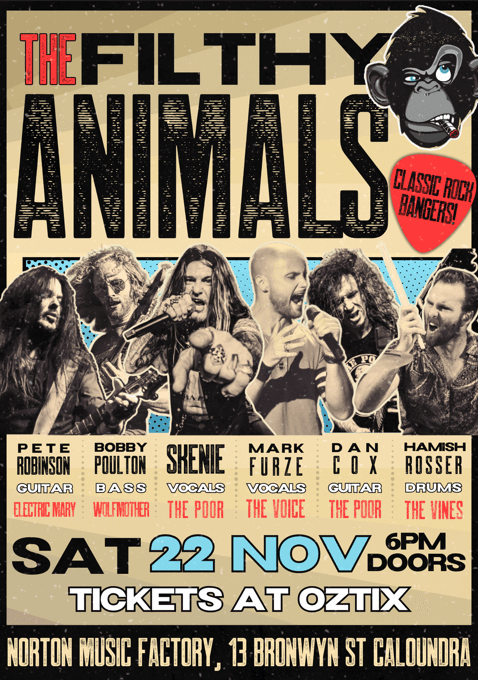 Get ready for a high-voltage night of pure rock power as The Filthy Animals hit the stage – featuring a rotating lineup of Aussie rock royalty from iconic bands like Dragon, Mondo Rock, Electric Mary, Baby Animals, Wolfmother, Choirboys, and more