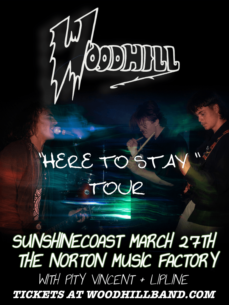 WoodHill bring their highly anticipated “Here To Stay” Tour to the Sunshine Coast, hitting the Norton Music Factory on March 27. Expect loud hooks, raw energy, and a no-holding-back live set as the Sydney three piece tear through new material and fan favourites. With Support from local heavy hitters Pity Vincent and Lipline, this is gonna be a party you don’t want to miss.